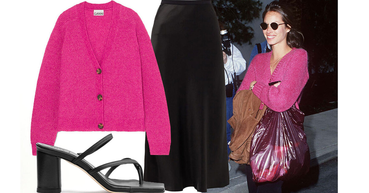 Супермодель умело использовала свое сотрудничества с Кельвином Кляйном — чистые линии, простые силуэты, базовые «вечные» вещи — она идеальна олицетворяла главный нью-йоркский бренд 90-х. Между показами она выбирала простые, но стильные комплекты. Например, как на снимке 1995 года. Цветной кардиган со струящейся юбкой, босоножки с тесемками и очки в круглой оправе — чем не образ для 2020. Все соответсвует текущим трендам. Тестируем такой комплект во время редкой прогулки до магазина, а потом носим все лето.