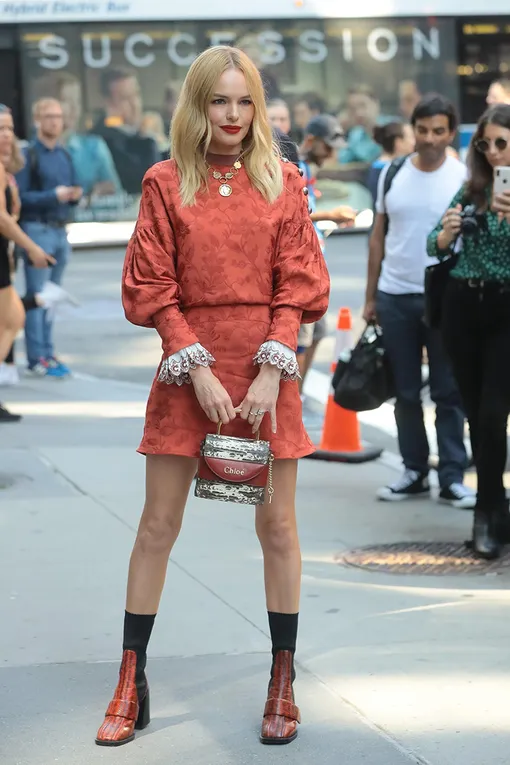 На днях на платформе Netflix стартует мини-сериал о веб-телевидении The I-Land, посвященный научной фантастике. Одна из главных ролей в нем досталась Кейт Босуорт. 11 сентября актриса посетила ряд мероприятий, приуроченных к премьере проекта, и за день успела дважды переодеться. Сперва она появилась на улицах Нью-Йорка в тотал-луке Chloé: мини-платье морковного оттенка, ботильонах-носках в тон и с миниатюрной сумкой на металлической ручке. Позже знаменитость переоделась в узкое платье австралийского бренда Bec + Bridge из рифленого нюдового трикотажа, через глубокий разрез которого виднелись бежевые ботфорты из мягкой кожи. Получилось гармонично и ультраженственно — и, конечно, с учетом всех актуальных трендов.