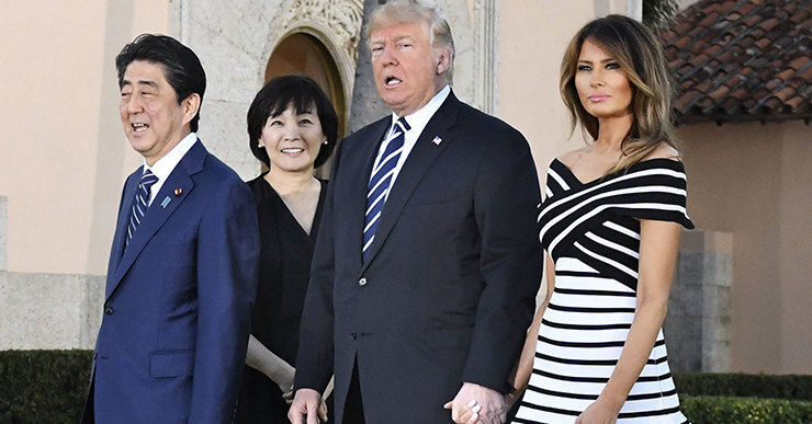На днях Мелания Трамп в одиночестве посетила мемориал Prescribed to Death, посвященный жертвам опиоидных препаратов. А теперь первая леди США воссоединилась с супругом, чтобы принять премьер-министра Японии Синдзо Абэ и его супругу Акиэ в своей частной резиденции «Мар-а-Лаго» во Флориде (к слову, президентская чета именно здесь сыграла свою свадьбу в 2004 году, и 26 апреля супруги отметят ее 14-ю годовщину).