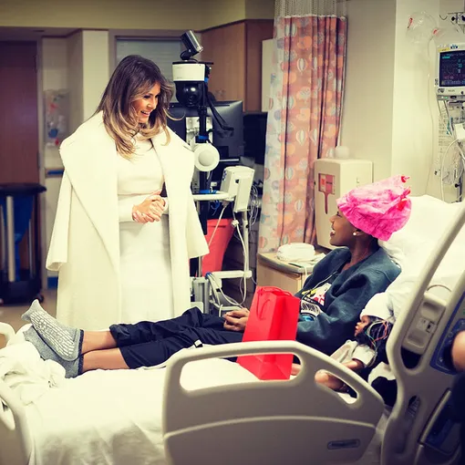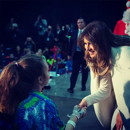 Поддержав пострадавших от урагана «Харви» в Техасе, Мелания Трамп вернулась в Вашингтон и отправилась в Детскую национальную больницу. По традиции, первая леди США встретилась с маленькими пациентами и лично почитала им сказку «Полярный экспресс», а компанию ей составил Санта-Клаус. Впрочем, и сама Мелания была похожа на Снегурочку в кремовых топе и юбке-карандаше, лодочках Manolo Blahnik и с наброшенным на плечи пальто Max Mara из шерсти альпаки. Дети закидали супругу президента вопросами: например, 10-летний Энди поинтересовался, как их гостья хотела бы провести Рождество, на что Мелания ответила: «Я мечтаю отдохнуть на безлюдном тропическом острове вместе с моими близкими». Трамп также призналась, что даже на рождественском столе предпочитает видеть полезные блюда: «После такой еды вы чувствуете легкость без переедания», — и рассказала, о чем попросила Санту в этом году: «О мире во всем мире, здоровье, любви и доброте».