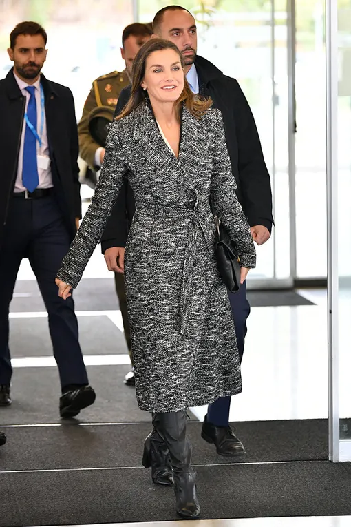 Длинное пальто с поясом в дуэте с высокими сапогами — что может быть практичнее в условиях приближающейся зимы. Королевам комбо тоже не чуждо. Например, супруга короля Испании Летиция посетила первую всемирную конференцию WHO в Женеве, посвященную проблемам здоровья и экологии. Она появилась на мероприятии в сером пальто, под которым прятался костюм-двойка с юбкой миди и белой блузой, а завершали образ кожаные ботфорты.