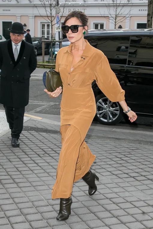 Для прогулки по французской столице Вики выбрала шелковое платье насыщенного горчичного оттенка — традиционно из своей новой коллекции,— и добавила к нему черные сапоги гармошкой и темные солнцезащитные очки — все от Victoria Beckham. Занимательная деталь: наша героиня каждый раз изобретательно придумывает, как необычно подать свои сумки. На днях Виктория положила клатч в карман своего пиджака, а теперь взяла сумку богатого болотного оттенка в руки, аккуратно сложив ремешок.