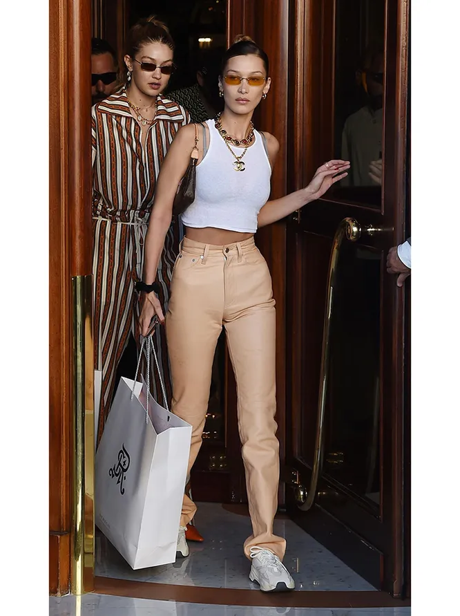 Каждую совместную деловую поездку сестры Хадид используют, чтобы вместе прогуляться по городу, отведать местных блюд и пообщаться друг с другом. На днях Белла и Джиджи прилетели во Флоренцию, чтобы принять участие в грандиозном шоу CR runway x LUISAVIAROMA, организованном Карин Ройтфельд, а в свободное время отправились изучать итальянские достопримечательности. Сестры выбрали образы в схожей коричнево-бежевой гамме: старшей из них приглянулся комплект из блузки и брюк в вертикальную полоску в любимом оверсайзе, а младшая надела светлый кроп-топ, джинсы и жакет в оттенке кофе с молоком, белоснежные кроссовки Yeezy и захватила с собой сумку Louis Vuitton с изображением панды.