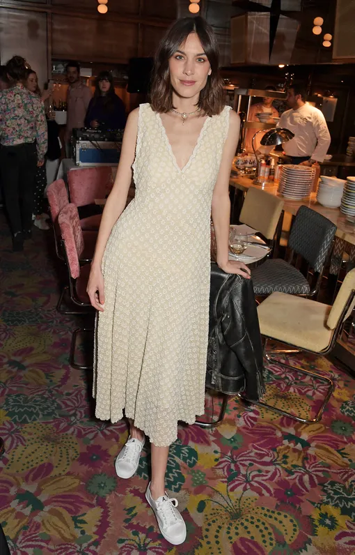 Игра на контрасте — излюбленный прием многих известных модниц при составлении аутфитов. Взять, к примеру, икону стиля и дизайнера Алексу Чанг. Известная фэшиониста устроила ланч в Лондоне в честь выхода своей весенней коллекции: для вечера Чанг выбрала свободное платье из струящейся ткани в оттенке слоновой кости и чокер с большой круглой жемчужиной. Чтобы образ не получился излишне романтичным, Алекса женственным туфлям предпочла светлые тканевые кеды (собственного авторства — с черной монограммой A), а на улице накинула сверху любимую косуху — идеальный образ в духе подруги байкера из фильмов о любви.