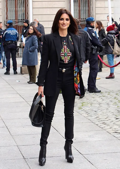 Крус выбрала для мероприятия любимый total black: блейзер с пестрой подкладкой и узкие брюки, которые подчеркнули заметно постройневшую фигуру актрисы, и добавила к образу топ Versace — видимо, Пенелопа никак не может расстаться с экранным образом Донателлы Версаче. А последним, но не менее эффектным штрихом стали ботильоны на платформе и высоком каблуке, в которых испанка дефилировала увереннее многих профессиональных моделей.