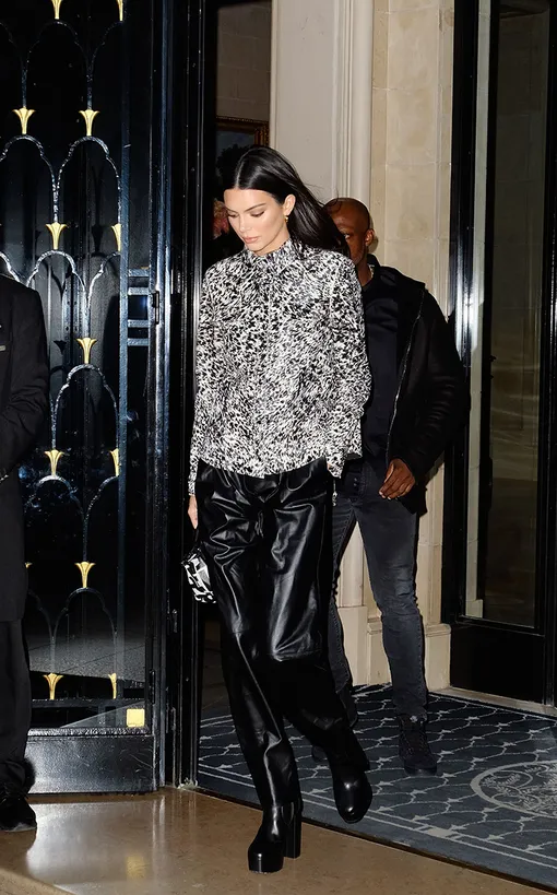 Кендалл Дженнер смело можно назвать трендсеттером – то, что топ-модель носила вчера, мы всем модным миром будем носить завтра. Так что на следующий сезон пора приготовить массивные ботинки на каблуке и с внушительной платформой. Именно в таких девушку застали фотографы минувшим вечером в Париже. Рубашка с абстрактным черно-белым принтом и кожаные широкие брюки тоже заслуживают внимания.