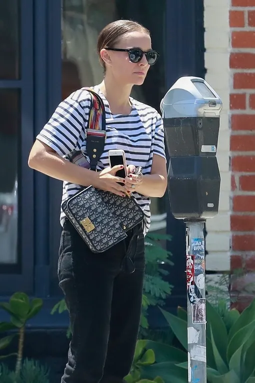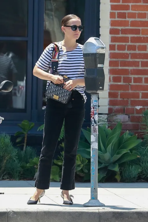 Будучи лицом Dior, Натали Портман регулярно появляется на светских мероприятиях в вещах бренда. Для непубличных будней актриса выбирает куда более прозаичные наряды, но отдает предпочтение интересным аксессуарам. Главная вещь, с которой знаменитость не расстается почти никогда, — это сумка французской марки на радужном широком ремешке. Она отлично дополняет любой базовый образ, например классические черные джинсы и свободную тельняшку. А завершили вчерашний наряд звезды «Черного лебедя» остроносые kitten heels с белой лентой. Так просто и так элегантно!