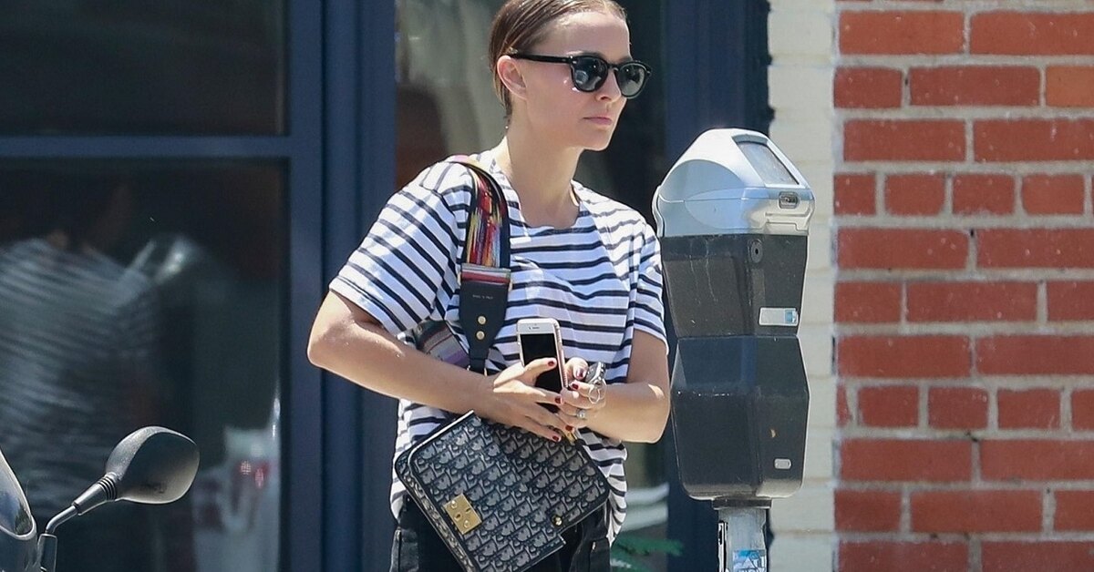 Будучи лицом Dior, Натали Портман регулярно появляется на светских мероприятиях в вещах бренда. Для непубличных будней актриса выбирает куда более прозаичные наряды, но отдает предпочтение интересным аксессуарам. Главная вещь, с которой знаменитость не расстается почти никогда, — это сумка французской марки на радужном широком ремешке. Она отлично дополняет любой базовый образ, например классические черные джинсы и свободную тельняшку. А завершили вчерашний наряд звезды «Черного лебедя» остроносые kitten heels с белой лентой. Так просто и так элегантно!