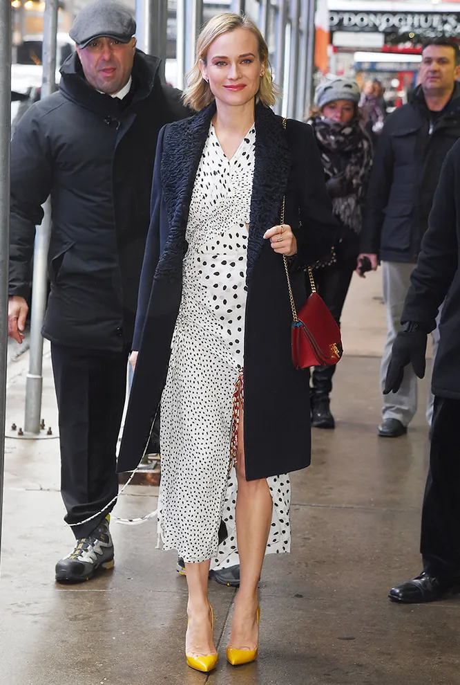 У Дианы Крюгер идеальный стиль. И очередное доказательство этого неоспоримого факта — вчерашний выход актрисы. Диана появилась на светском мероприятии в легком платье Jason Wu и модельном прямом пальто с каракулевым воротником. Дополнили комплект желтые лодочки и алая сумка на цепочке.