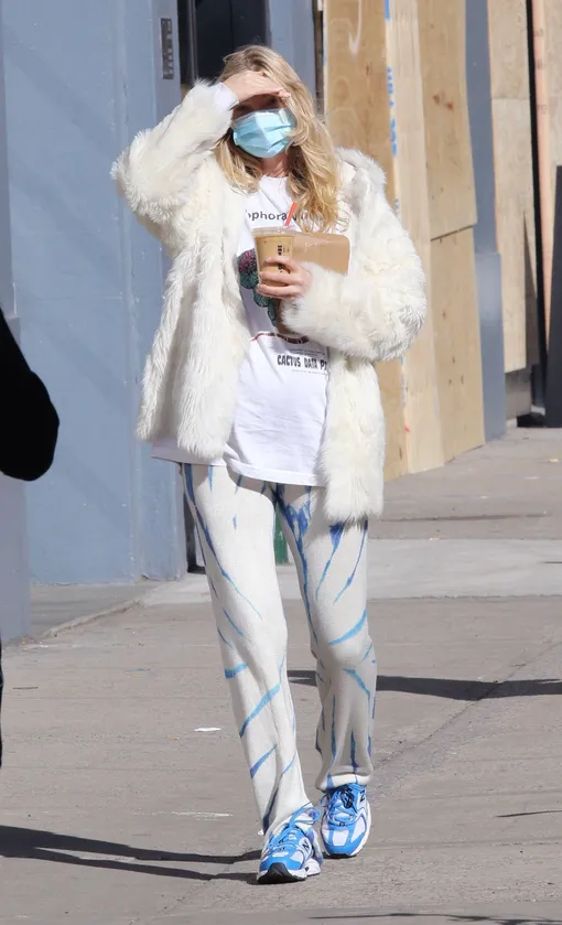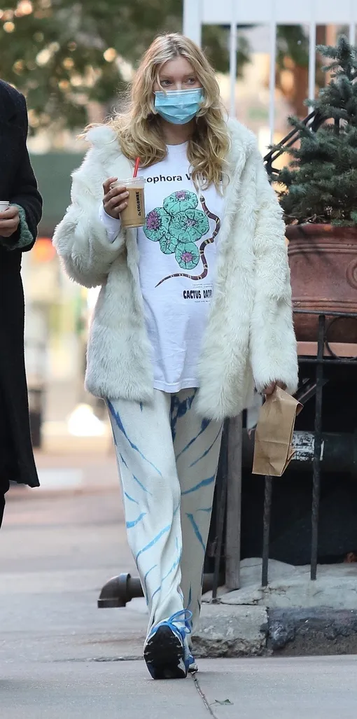 Эльза с гордостью носит вызывающие бикини не по размеру и позирует полуобнаженной. Однако прохладная осень в Нью-Йорке заставила утеплиться и нашу любительницу раздеваться. Будущая мама отправилась на утреннюю прогулку вместе с возлюбленным Томом Дейли, основателем бренда District Vision. Эльзе пришлось утеплиться, чтобы пешая прогулка с кофе оказалась более комфортной. Наша героиня составила стильный зимний кэжуал-образ в оттенках белого и голубого. Она надела футболку оверсайз с графическим принтом в дуэте со спортивными штанами тай-дай. На плечи Эльза накинула уютную пушистую шубу белого цвета, а завершила образ базовыми кроссовками.