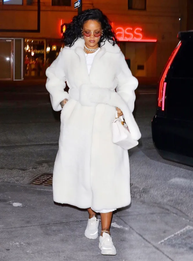 Рианна носит белоснежную шубу Celine с кроссовками на босу ногу