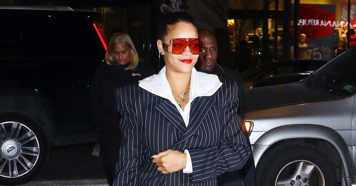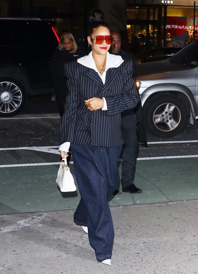 В своих образах Рианна часто использует самоиронию и создает забавные эклектичные аутфиты, которые украшают хроники стритстайла. В одном из них вчера певица отправилась на встречу с друзьями в Нью-Йорке: теплой верхней одежде наша героиня предпочла свободный блейзер в светлую полоску и гиперширокие брюки со стрелками. К этому ансамблю в любимом формате оверсайз Рири добавила белоснежное худи (неожиданный выбор!), остроносые ботильоны и светлую кожаную сумку, а главным акцентом в образе стали солнцезащитные очки с красными стеклами, закрывшие пол-лица улыбающейся Рианны.