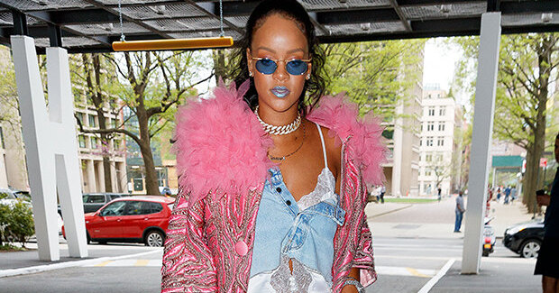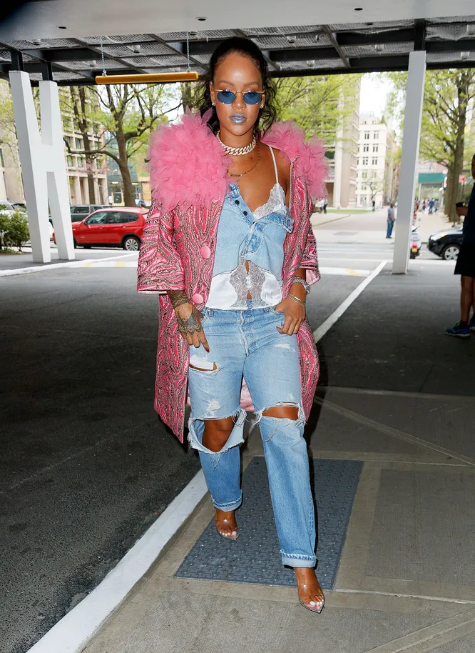 Когда ты Рианна, то можешь позволить себе все, в том числе и носить такие вещи, которые кто-то другой вряд ли бы осмелился даже взять в руки. Вчера в Нью-Йорке певица появилась в деконструированном джинсовом костюме, пальто в цвете клубничной жвачки и голубых очках в цвет помаде. Ждем, в чем же Рири появится на сегодняшнем Met Gala.