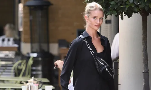 23 августа папарацци запечатлели Роузи Хантингтон-Уайтли на прогулке с сыном по Лондону. Топ-модель была одета, как всегда, удобно и со вкусом: в расклешенные черные брюки с разрезами на щиколотках, бело-розовые кеды adidas, свободную черную рубашку, будто снятую с плеча ее жениха Джейсона Стейтема, и с кожаной поясной сумкой, надетой через плечо.