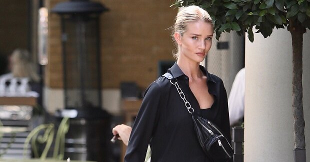 23 августа папарацци запечатлели Роузи Хантингтон-Уайтли на прогулке с сыном по Лондону. Топ-модель была одета, как всегда, удобно и со вкусом: в расклешенные черные брюки с разрезами на щиколотках, бело-розовые кеды adidas, свободную черную рубашку, будто снятую с плеча ее жениха Джейсона Стейтема, и с кожаной поясной сумкой, надетой через плечо.