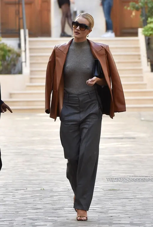 У парижских уличных фотографов сейчас нет перерывов в работе: из-за Недели моды по улицам французской столицы практически постоянно ходят мировые знаменитости. Так, 26 сентября среди прочих селебрити была замечена Роузи Хантингтон-Уайтли. Топ-модель была одета в строгие «офисные» брюки, жакет из рыжевато-коричневой кожи и серый топ без рукавов с высоким горлом. Ткань последнего оказалась достаточно тонкой, а потому при малейшем порыве ветра стало заметно, что невеста Джейсона Стэйтема решила не надевать бюстгальтер. И так довольно скромный лук в мгновение ока оказался дерзким и весьма провокационным.