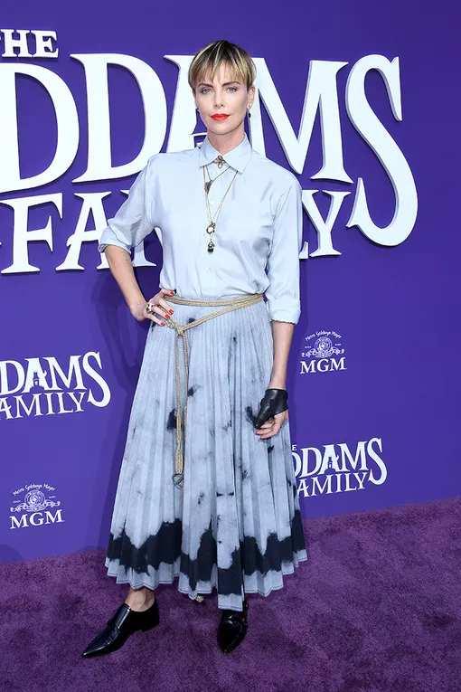 Мы не перестаем восхищаться новой прической Шарлиз Терон. В очередной раз она продемонстрировала новый имидж на премьере анимационного фильма «Семейка Аддамс», где актриса озвучила несравненную Мортишу Аддамс. На премьере в Лос-Анджелесе Шарлиз появилась в комплекте из плиссированной юбки с эффектом тай-дай и голубой рубашки, застегнутой на все пуговицы. Тонкий пояс и множество цепочек завершили образ.