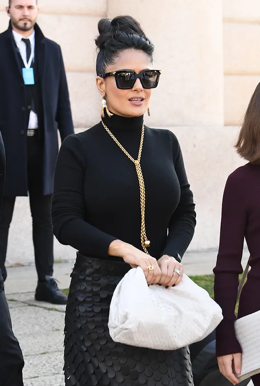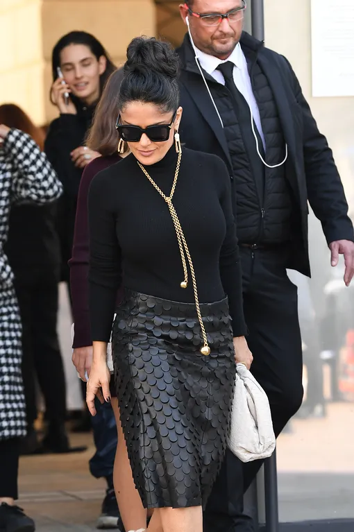 22 февраля Сальма Хайек посетила показ Bottega Veneta. И если для похода на шоу Gucci, прошедшее на днях, актриса предпочла довольно яркий и эксцентричный образ, то сегодня ее можно было увидеть в строгом и сдержанном луке. Правда, с необычными акцентами: так, кожаная юбка-карандаш напоминала русалочий хвост, а массивный золотой «галстук» на шее поверх простой черной водолазки добавил луку изысканности.