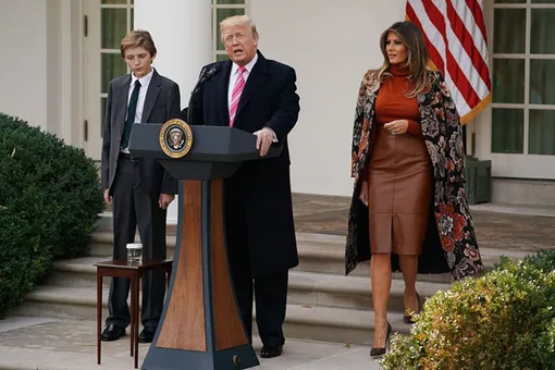 В США дали старт праздничному рождественскому сезону, который начинается с Дня благодарения. В преддверии праздника в Розовом саду президентской резиденции прошла традиционная церемония помилования индейки, в которой приняли участие все члены семьи Трамп: компанию президенту США и первой леди составил их сын Бэррон, старшая дочь Дональда Иванка с мужем Джаредом Кушнером и детьми, а также младшая дочь президента Тиффани. Впрочем, все внимание, как обычно, было приковано к первой леди. Мелания появилась перед гостями в узкой коричневой кожаной юбке-карандаше, рыжей водолазке и пальто с пестрым цветочным рисунком. В классическую осеннюю палитру идеально вписались и остроносые лодочки из коричневой кожи.