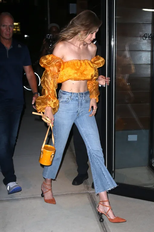 Как превратить синие джинсы в вечерний образ? Добавить к ним романтичный топ с объемными рукавами и открытыми плечами, каблуки и маленькую сумочку. Готово. В таком образе смело отправляйтесь на вечеринку или свидание. Джиджи Хадид предпочла последний вариант. Обратите внимание на цвет: Gen Z yellow - самый популярный в этом сезоне.