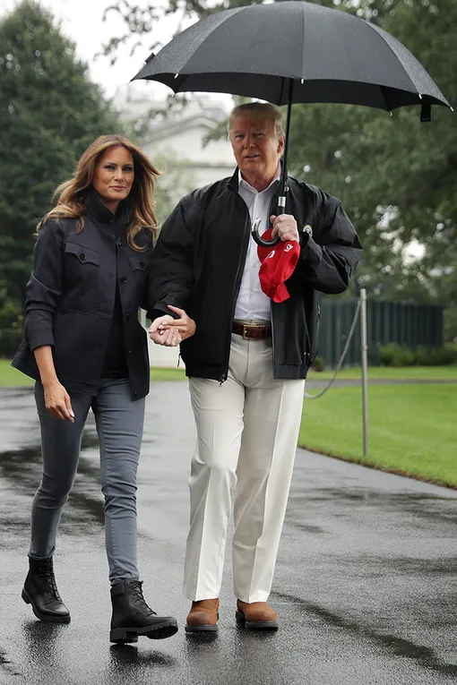Несмотря на непогоду, Дональд выбрал светлые брюки и рубашку, а вот Мелания оказалась более практичной: она отказалась от лодочек и узких юбок (на время, конечно!) и предпочла им графитовые скинни, черную куртку-бушлат и армейские ботинки на шнуровке.