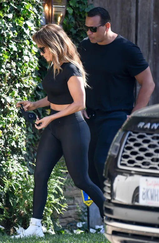 Джей Ло и Алекс отправились лично посмотреть этот дом — и выбрали для этой цели парные образы. Несмотря на калифорнийскую жару, пара остановилась на черных тотал-луках. Певица надела кроп-топ с короткими рукавами и легинсы: такой наряд подчеркнул ее точеную фигуру и упругий пресс, над которым Дженнифер трудится каждый день, не давая себе никаких поблажек.