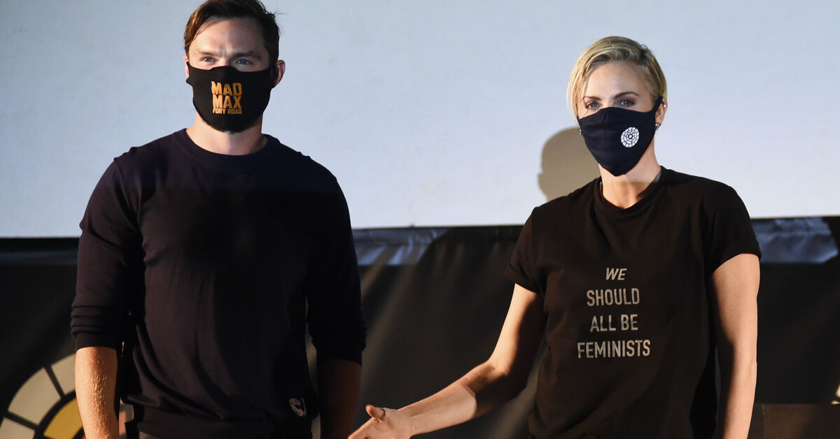 Шарлиз в этот вечер была одета в футболку с надписью We should all be feminists из дебютной коллекции Марии Грации Кьюри для французского модного Дома Dior, белые джинсы прямого кроя и кеды. Компанию Терон составил актер Николас Холт, который тоже сыграл в фильме «Безумный Макс».