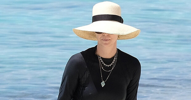 Актриса настолько уверена в своем теле, что не видит нужды лишний раз демонстрировать идеальную фигуру даже на отдыхе (исключение делается разве что для ног). К тому же, не всем SPF-кремам можно доверять, поэтому на пляже Шарлиз появилась в черной спортивной рубашке серфера — рашгарде. На доске Терон мы так и не увидели, но успели оценить модные аксессуары: соломенную широкополую шляпу и черные очки. На Багамах 43-летняя актриса проводит время с детьми, сыном Джексоном и дочкой Августой.