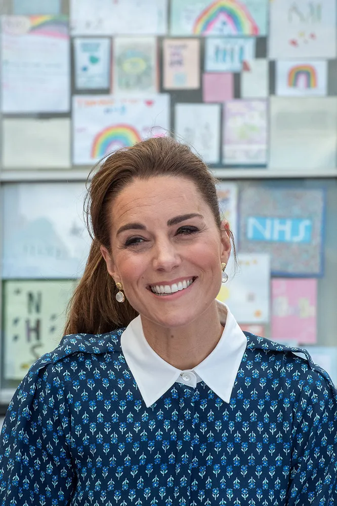 Кэтрин снова использовала свой любимый прием: она выбрала цвет платья так, чтобы подчеркнуть свое уважение к медикам. Синий символизирует службу здравоохранения. Длинное шелковое платье в пол Beulah London с геометрическим принтом идеально подчеркнуло стройную фигуру герцогини.