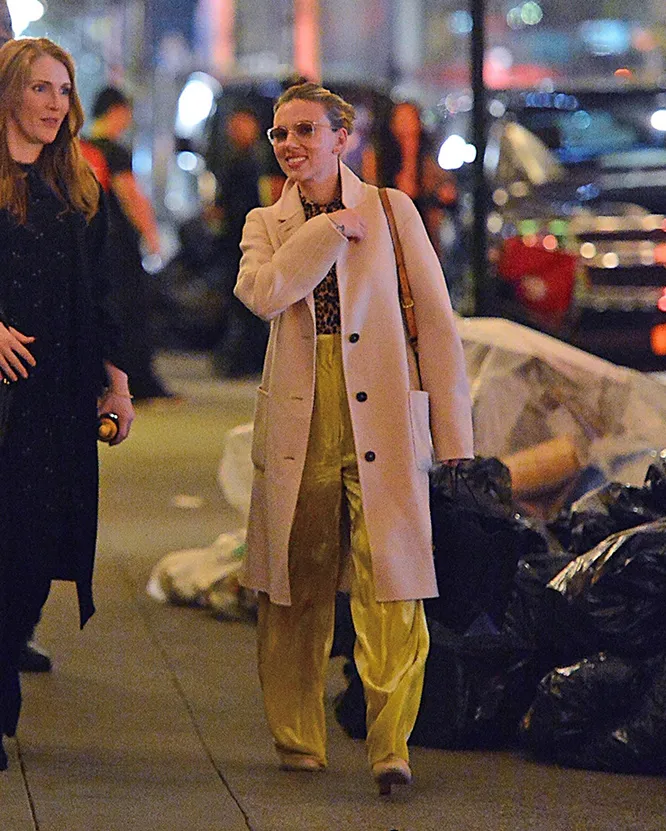 Шелковые брюки и прямое пальто: Скарлетт Йоханссон на прогулке в Нью-Йорке