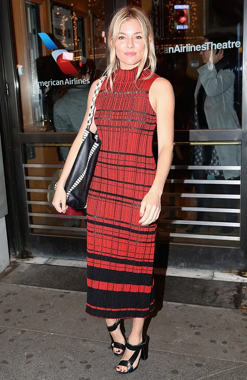 Для бродвейского вечера Сиенна выбрала облегающее алое платье-лапшу в черную полоску и темные кожаные босоножки на высоком, но устойчивом каблуке. Миллер не стала брать с собой миниатюрный клатч или ультрамодную поясную модель, а предпочла им вместительную сумку-шопер из черной и белой кожи — в конце концов, современные модницы могут не только следовать трендам, но и лично создавать их.
