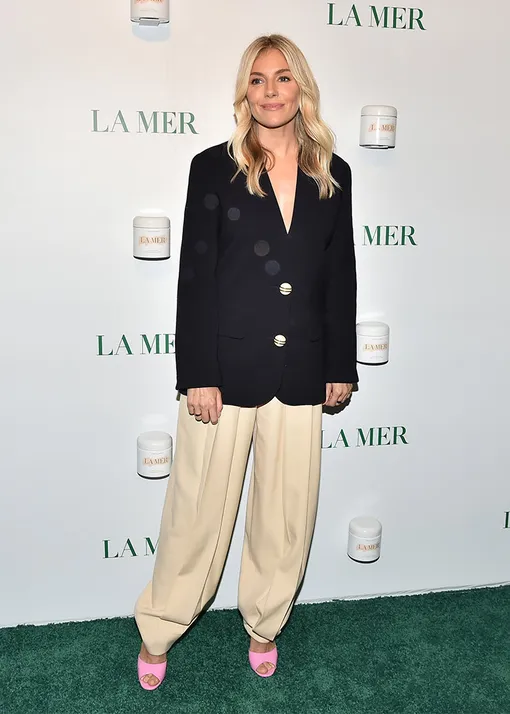 Сиенна Миллер вечером 3 октября посетила ужин бьюти-бренда La Mer, прошедший в Нью-Йорке. Несмотря на дождливую погоду, актриса не побоялась надеть светлые брюки-шаровары и открытую обувь — ярко-розовые мюли на невысоком каблуке. Образ знаменитость дополнила свободным жакетом словно с мужского плеча, но даже в таком наряде ей удалось не потеряться. Прекрасный вариант для осени — только лучше, конечно, не рисковать и надеть теплые ботинки или казаки.