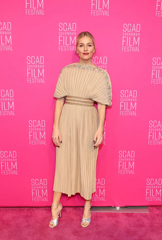 Сиенна Миллер прилетела в штат Джорджия, чтобы посетить фестиваль SCAD Savannah, который стартовал накануне вечером в театре Trustees. В ходе торжественной церемонии актрисе присудили именную награду, и красавица вышла получать ее в плиссированном миди-платье нюдового оттенка, верх которого напоминал раковину морского гребешка, по краю украшенную мерцающими стразами. А завершили образ серебристые босоножки на шпильке.