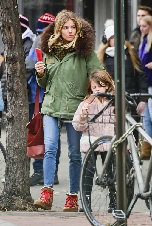 Сиенна Миллер в самой уютной парке и сапогах-луноходах гуляет с дочкой по морозному Нью-Йорку