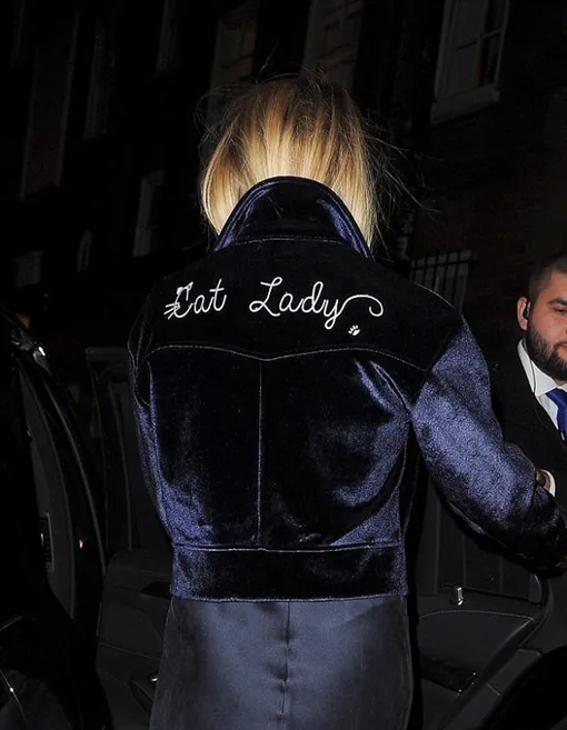Сиенна Миллер в шелковом платье и бархатном бомбере с «кошачьей» вышивкой