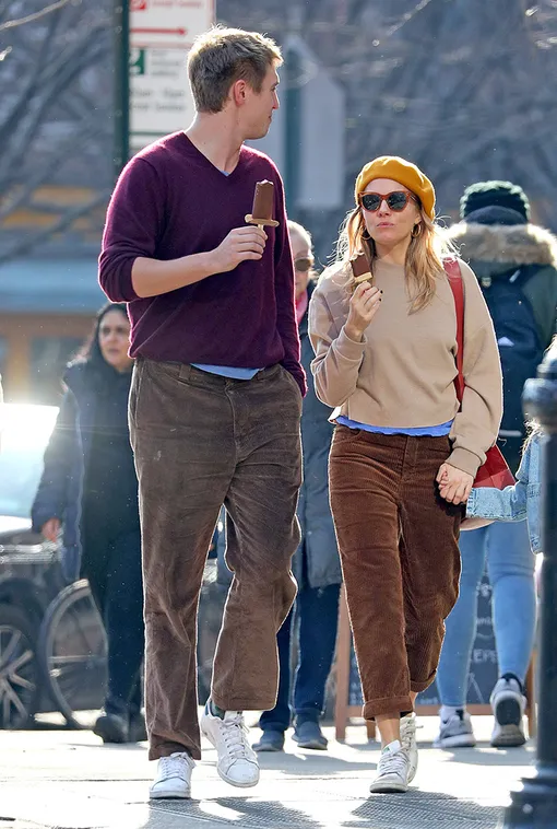 Не так давно стало известно, что у Сиенны Миллер новый роман. Оказалось, актриса встречается с арт-дилером Лукасом Цвирнером на 10 лет моложе себя. Но разница в возрасте влюбленных совсем не волнует: рядом друг с другом они выглядят очень гармонично. И даже одеваются в похожие вещи! Например, 5 февраля папарацци застали парочку на прогулке по Нью-Йорку в почти одинаковых вельветовых брюках, уютных джемперах и белых кедах. Сиенна также дополнила образ беретом в французском стиле и алой кожаной сумкой-мешком.