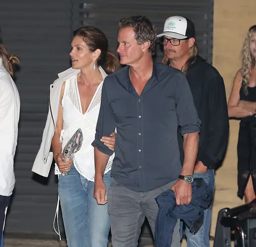 Для семейного вечера 52-летняя топ-модель выбрала классические джинсы клеш и белый топ с V-образным вырезом. На ее плечи была накинута серая кожаная куртка, а в руках виднелся прямоугольный клатч. Завершили образ крупные серьги в форме капель. Рэнди же предпочел черную рубашку, темно-серые джинсы и кожаные черные кеды на белой подошве.