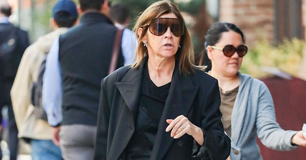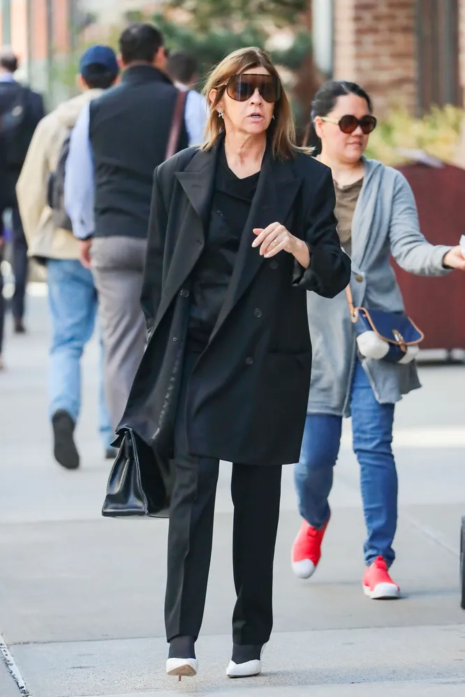 У кого учиться стилю, как не у Карин Ройтфельд. Французский редактор и стилист знает, как выглядеть модно даже в классическом костюме-двойке. Во-первых, он должен идеально сидеть по фигуре, даже если пиджак будет немного оверсайз. Модные украшения вроде необычных сережек-крестов и огромных солнцезащитных очков придадут образу смелости, а белые лодочки — разбавят монохром.