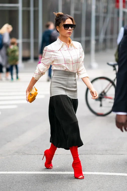 Повседневные образы Виктории Бекхэм можно разбирать на цитаты: укороченный свитер мятного цвета она носит в паре с красной рубашкой, поверх телесного боди набрасывает легкий тренч, а к скромному платью с длинным рукавом выбирает эффектные лодочки цвета фуксии. Предлагаем последовать примеру Вики и начать экспериментировать с самыми необычными сочетаниями материалов, форм и цветов. Дождливая погода нам тут только на руку!