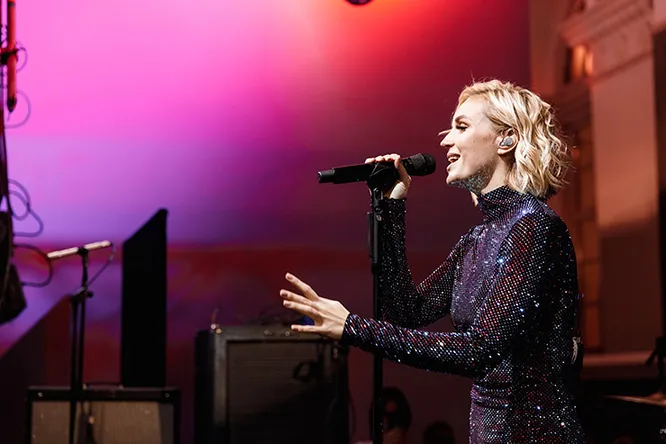 Александр Терехов любит одевать Полину Гагарину в стразы, поэтому остается только догадываться, какое еще платье он придумает для звезды. На открытии 37-го сезона Mercedes-Benz Fashion Week Russia Полина поднялась на сцену в сияющем красно-фиолетовом наряде из последней осенне-зимней коллекции — такое же, кстати, доступно в макси-длине и с глубоким вырезом на спине. Переодевшись после концерта в total black (мы в восторге от этих виниловых брюк!), девушка дала интервью ведущей Снежине Куловой в лаундж-зоне Mercedes-Benz и сфотографировалась с поклонниками.
