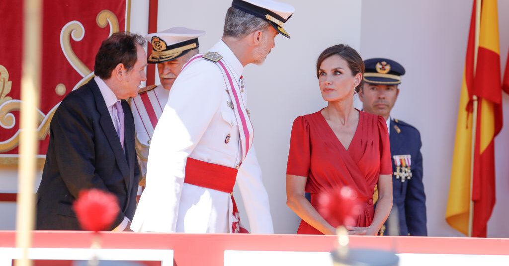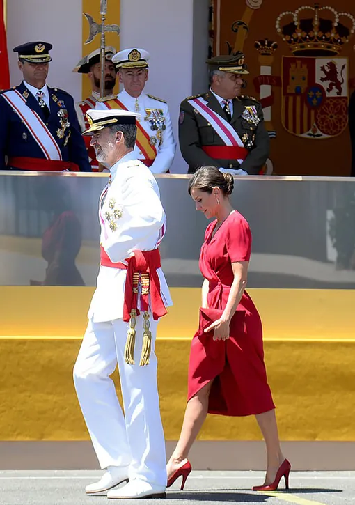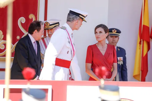 Вчера в Севилье праздновали День Вооруженных сил. В числе почетных гостей на торжественную церемонию прибыла и королева Летиция. Для выхода в свет супруга Филиппа VI выбрала элегантное красное платье испанского бренда Cherubina с V-образным вырезом, драпировкой и асимметричным подолом. В таком наряде Летиция выглядела просто и одновременно по-королевски роскошно. Образ дополнили туфли на устойчивом каблуке, сумка-конверт из замши Magrit и серьги из белого золота, бриллиантов и рубинов из фамильной шкатулки испанских Бурбонов.