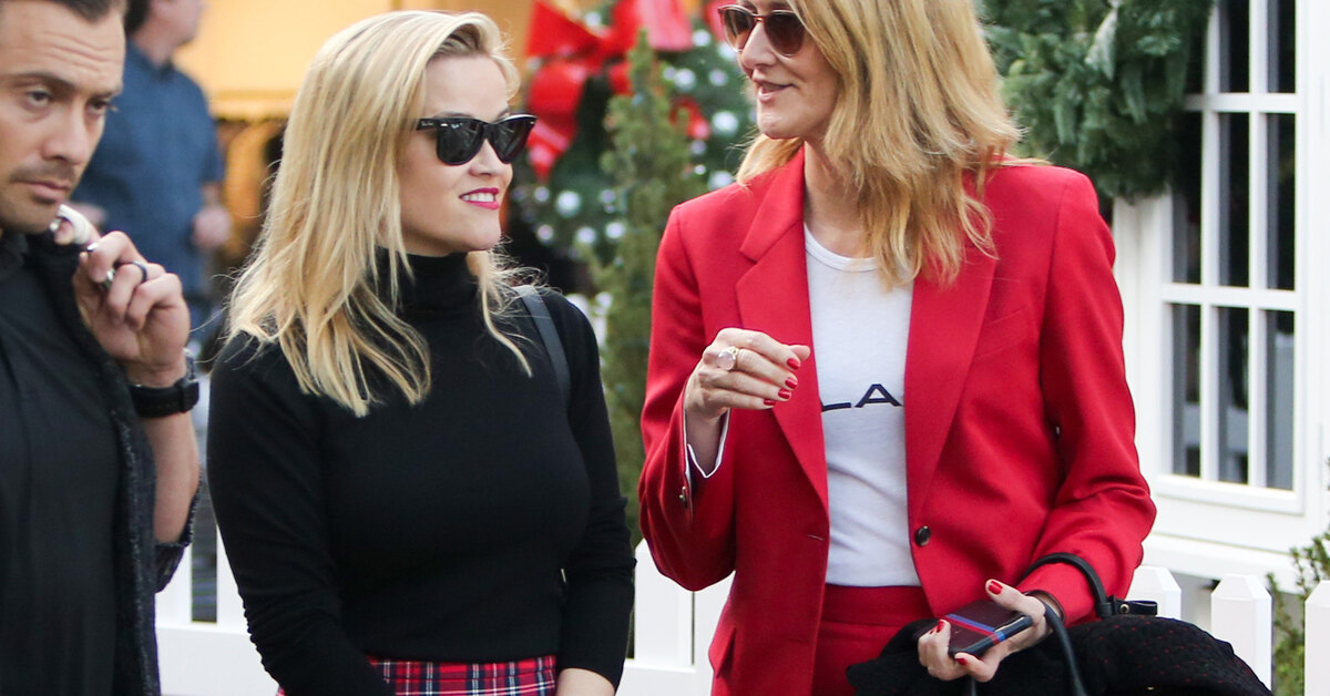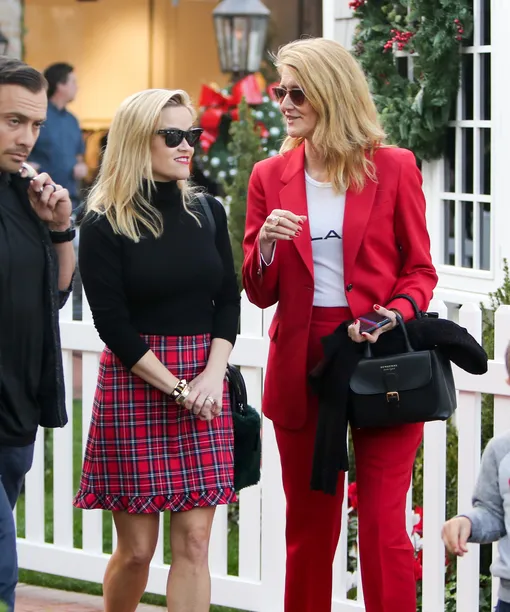 Звезды сериала «Большая маленькая ложь» Риз Уизерспун и Лора Дерн дружат в реальной жизни. Вчера папарацци поймали актрис во время прогулки по Брентвуду – престижному району Лос-Анджелеса, где живут многие знаменитости. Для своего выхода девушки выбрали простые, но стильные наряды, сделав ставку на красный цвет. Риз надела клетчатую мини-юбку, которую дополнила черным гольфом, ботильонами, очками Ray-Ban и золотыми браслетами, а Лора отправилась на прогулку в брючном костюме, сапогах-казаках и с сумочкой Burberry. Подруги все время улыбались и даже крепко обнялись на прощание.