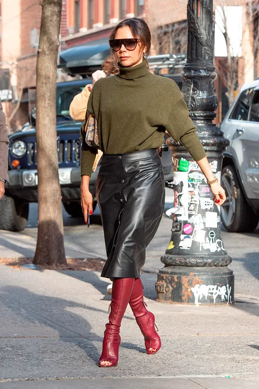 Каждый новый выход Виктории Бекхэм — очередная порция вдохновения. Вчера дизайнер появилась на улицах Большого яблока в свитере цвета хаки, который надела с кожаной юбкой и сапогами-чулками с открытым мысом бордового оттенка. Беспроигрышное сочетание!