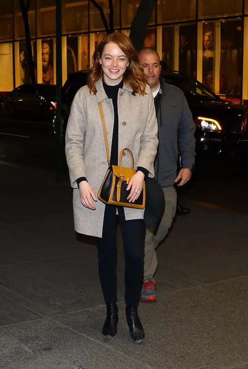 Эмма Стоун часто блистает на красной дорожке в аутфитах ярких цветов. Однако в повседневной жизни актриса предпочитает максимально комфортные и неброские наряды. Вот и на свидание со своим бойфрендом Дэйвом МакКери, которое прошло в нью-йоркском ресторане Lattanzi, знаменитость оделась достаточно просто. Эмма выбрала темно-синие джинсы прямого кроя, черную водолазку и укороченное бежевое пальто оверсайз. При этом образ звезды фильма «Фаворитка» нельзя назвать скучным — все благодаря идеально подобранным аксессуарам. Наше внимание, конечно же, привлекли стильная черная сумка кросс-боди с коричневой отделкой и кожаные ботильоны с широким носом. Ничего лишнего!