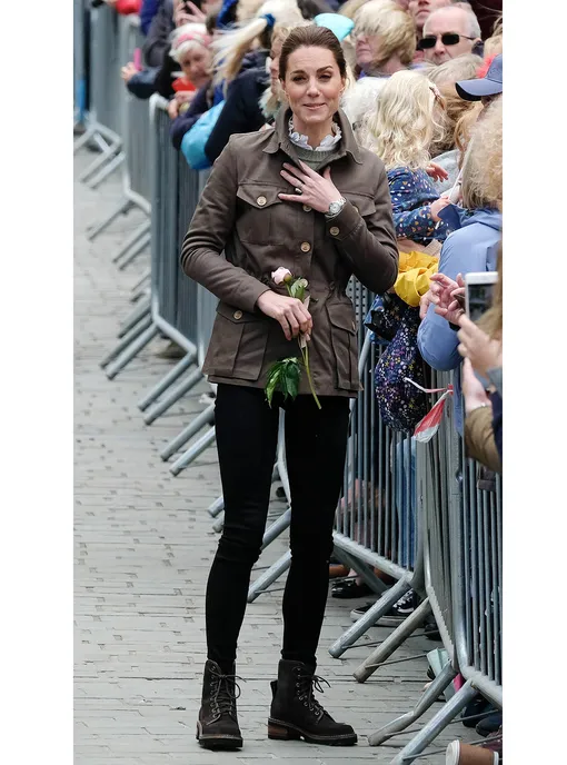 Если мы дождались жаркого и солнечного лета, то жителям британского графства Камбрия не так повезло с погодой. Сегодня в этот северо-западный уголок королевства приехали почетные гости — Кейт Миддлтон и принц Уильям, и, судя по одежде и обуви герцогини Кембриджской, лето в этих краях — специфическое. Кейт в застегнутой куртке в милитари-стилистике, под которой виднелся свитер и блуза с оборками, а также в черных скинни и ботинках на шнуровке с улыбкой поприветствовала собравшихся. Жители графства в ответ устроили теплый прием, который ничуть не соответствовал пасмурному дню: Миддлтон так растрогало их внимание, что она подольше задержалась рядом с местными жителями, отвечая на вопросы и делая фото на память.