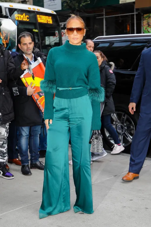 Свитер с мехом на локтях и «пижамные» брюки: изумрудное комбо Дженнифер Лопес
