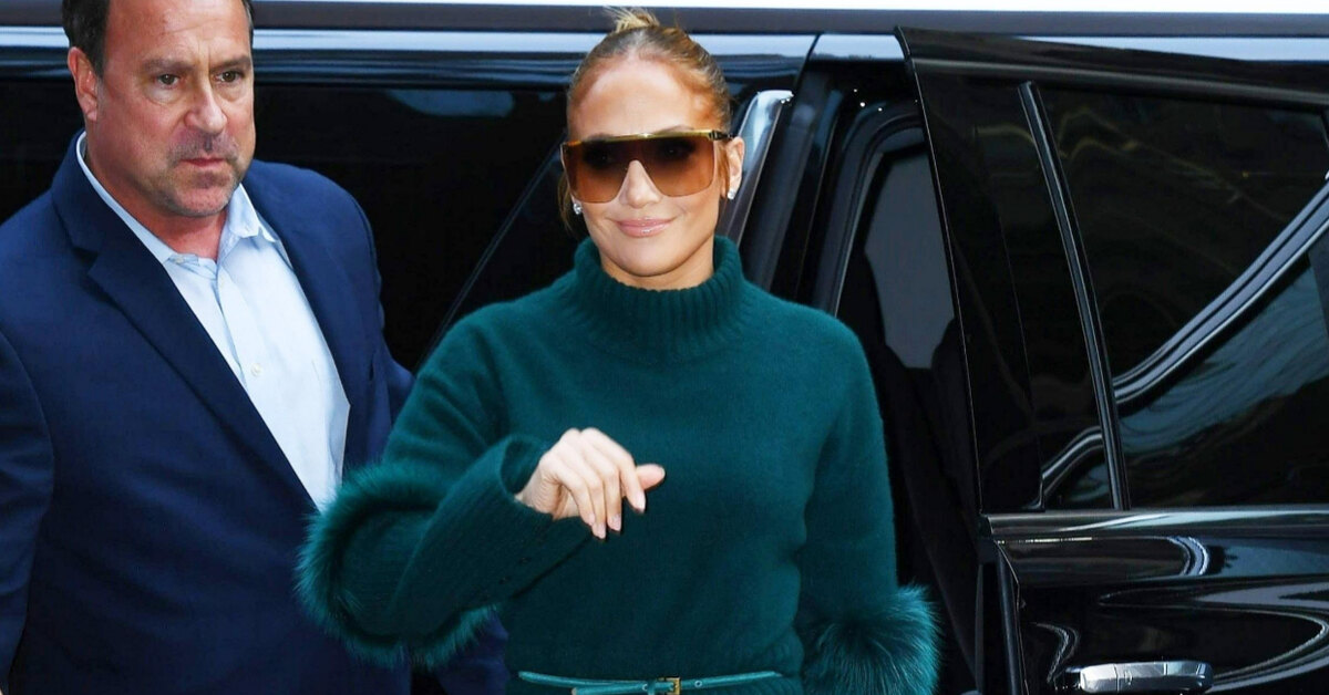 Свитер с мехом на локтях и «пижамные» брюки: изумрудное комбо Дженнифер Лопес