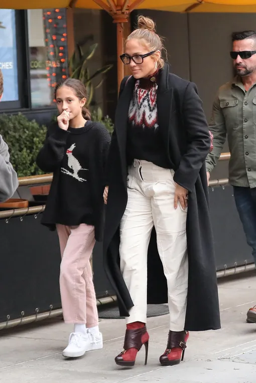 Хотя рост Дженнифер Лопес — 164 см — вполне попадает под понятие среднего, дива любит казаться выше и часто надевает обувь на очень высоком каблуке. Вчера Дженнифер отправилась на ланч с женихом Алексом Родригесом и дочерью Эммой и выбрала для семейного выхода замшевые ботильоны с кожаными вставками на умопомрачительно высоких шпильках. Необычную и не слишком устойчивую пару Лопес объединила с белыми брюками, шерстяным свитером и черным однобортным пальто, а дочь заботливо поддерживала звездную маму во время прогулки.