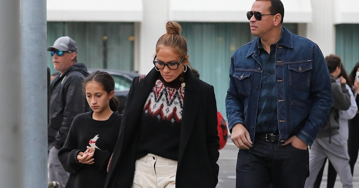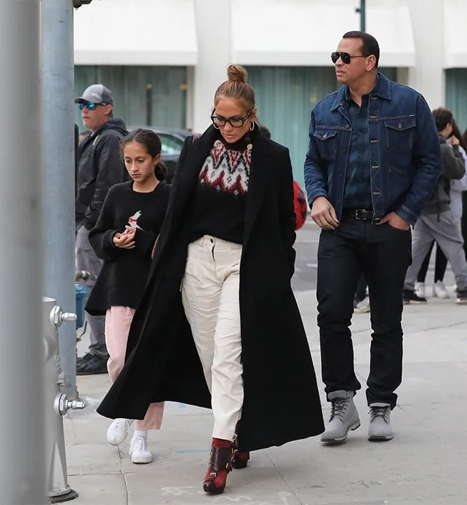 Хотя рост Дженнифер Лопес — 164 см — вполне попадает под понятие среднего, дива любит казаться выше и часто надевает обувь на очень высоком каблуке. Вчера Дженнифер отправилась на ланч с женихом Алексом Родригесом и дочерью Эммой и выбрала для семейного выхода замшевые ботильоны с кожаными вставками на умопомрачительно высоких шпильках. Необычную и не слишком устойчивую пару Лопес объединила с белыми брюками, шерстяным свитером и черным однобортным пальто, а дочь заботливо поддерживала звездную маму во время прогулки.