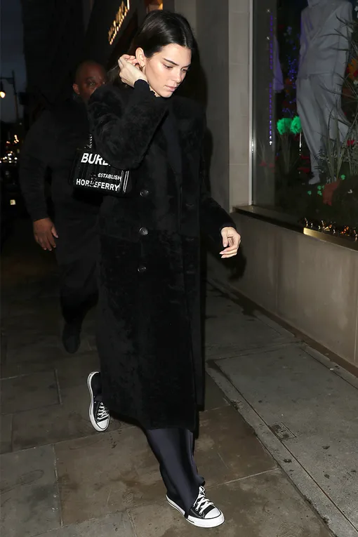 Кендалл выбрала длинную вельветовую шубу Balenciaga в базовом черном оттенке. Брюнетка надела водолазку в оттенке «полуночный синий» и атласные пижамные брюки благородного синего цвета. Финальным штрихом всего ансамбля стали черные кеды Converse и кожаная сумка Burberry на серебряной цепочке.